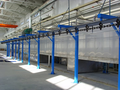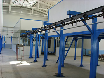 工件通过输送链进入喷粉房的喷枪位置准备喷涂作业。静电发生器通过喷枪枪口的电极针向工件方向的空间释放高压静电(负极),喷枪口喷出的粉末和压缩空气的 混合物以及电极周围空气电离(带负电荷)。工件经过挂具通过输送链接地(接地极),这样就在喷枪和工件之间形成一个电场粉末在电场力和压缩空气压力的双重 推动下到达工件表面,依靠静电吸引在工件表面形成一层均匀的涂层。